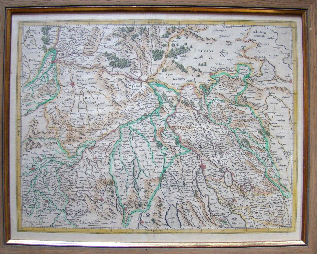 "ET PROVINCE DE BASLE", Kupferstich, handkoloriert, doppelseitig gerahmt, 35.5 x 47 cm, Amsterdam 1633