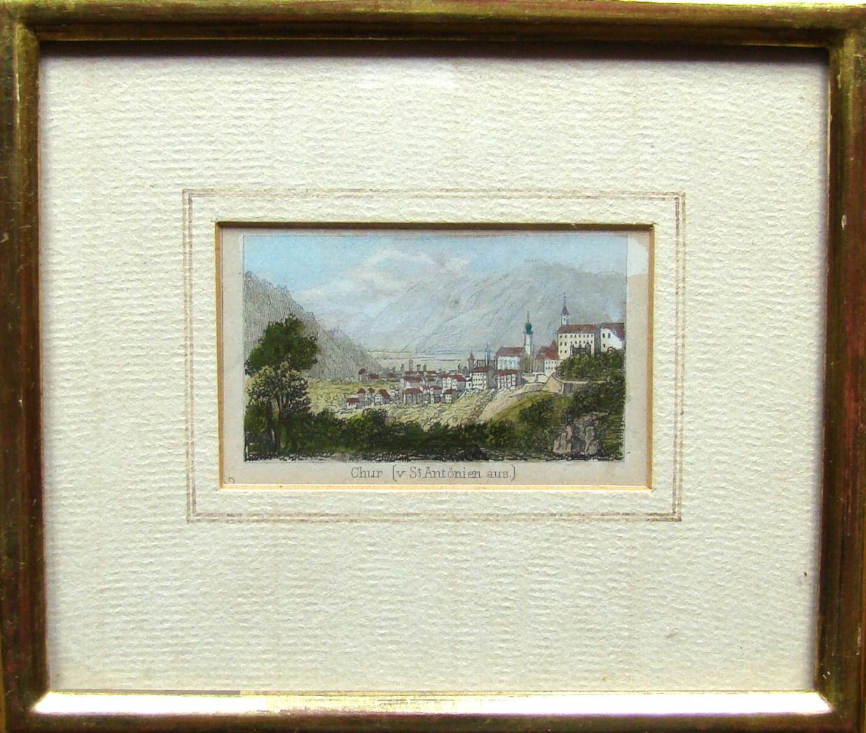 Ansicht der Stadt Chur mit Sicht auf den Hof, Martinskirche und den Calanda, Stahlstich, handkoloriert, gerahmt im Passepartout, 4 x 6.5 cm, ca.1850 / 1860