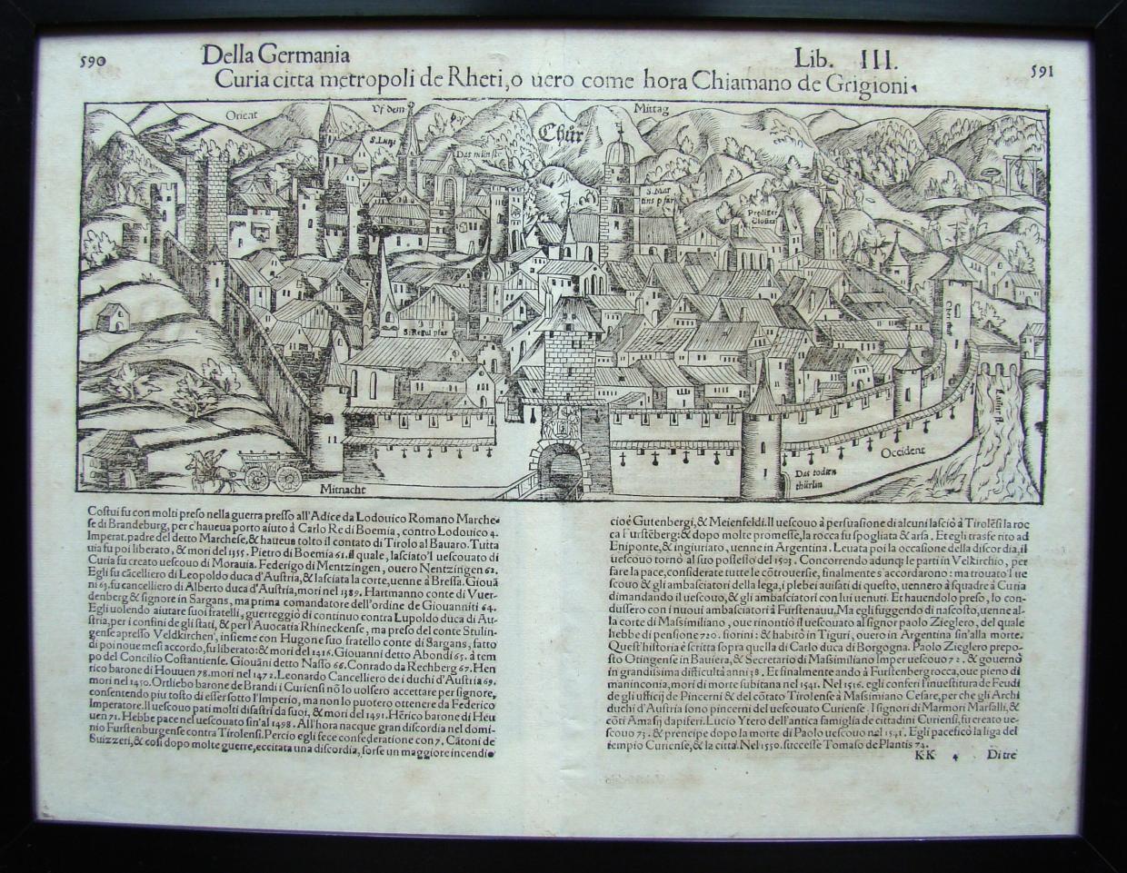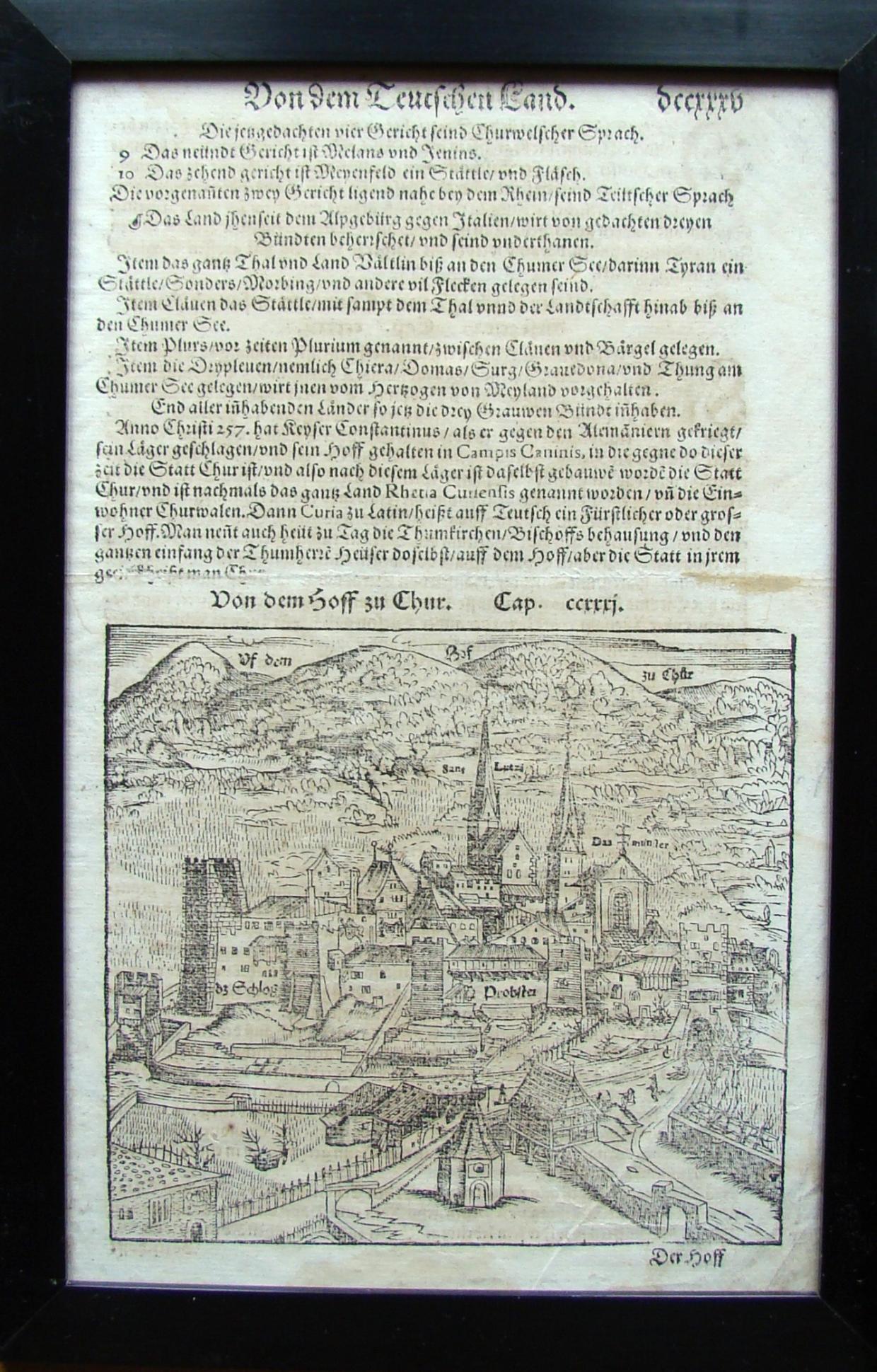 Ansicht der alten Stadt Chur. , Holzschnitt, gerahmt. Doppelseitig verglast. Rückseite Textansicht, Basel, 1574