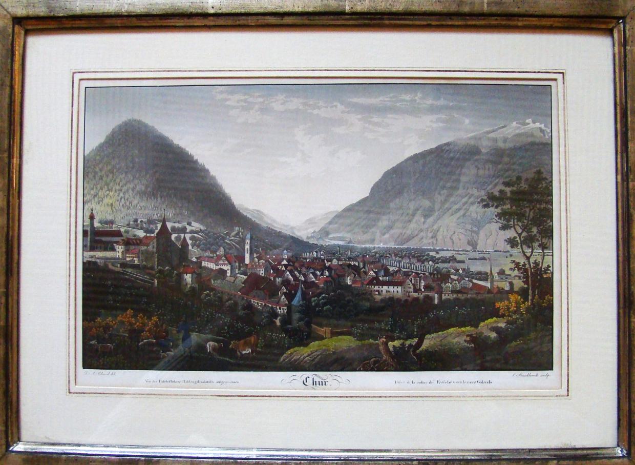 von der Bischöflichen Halden gegen den Calanda aufgenommen, Lithographie, handkoloriert. gerahmt, 21 x 32 cm, 1861