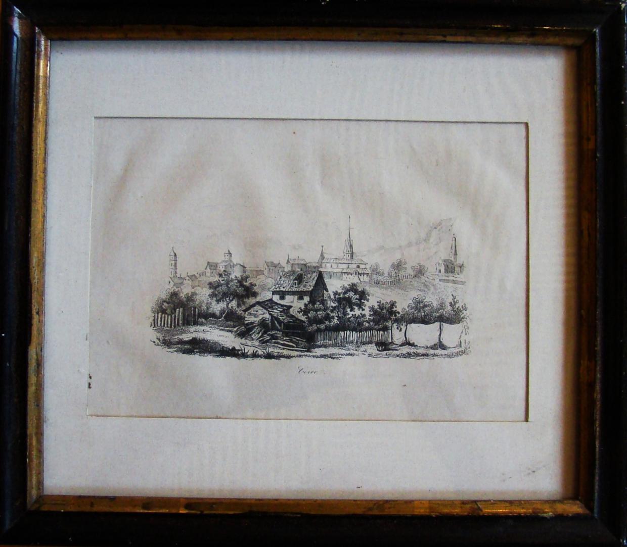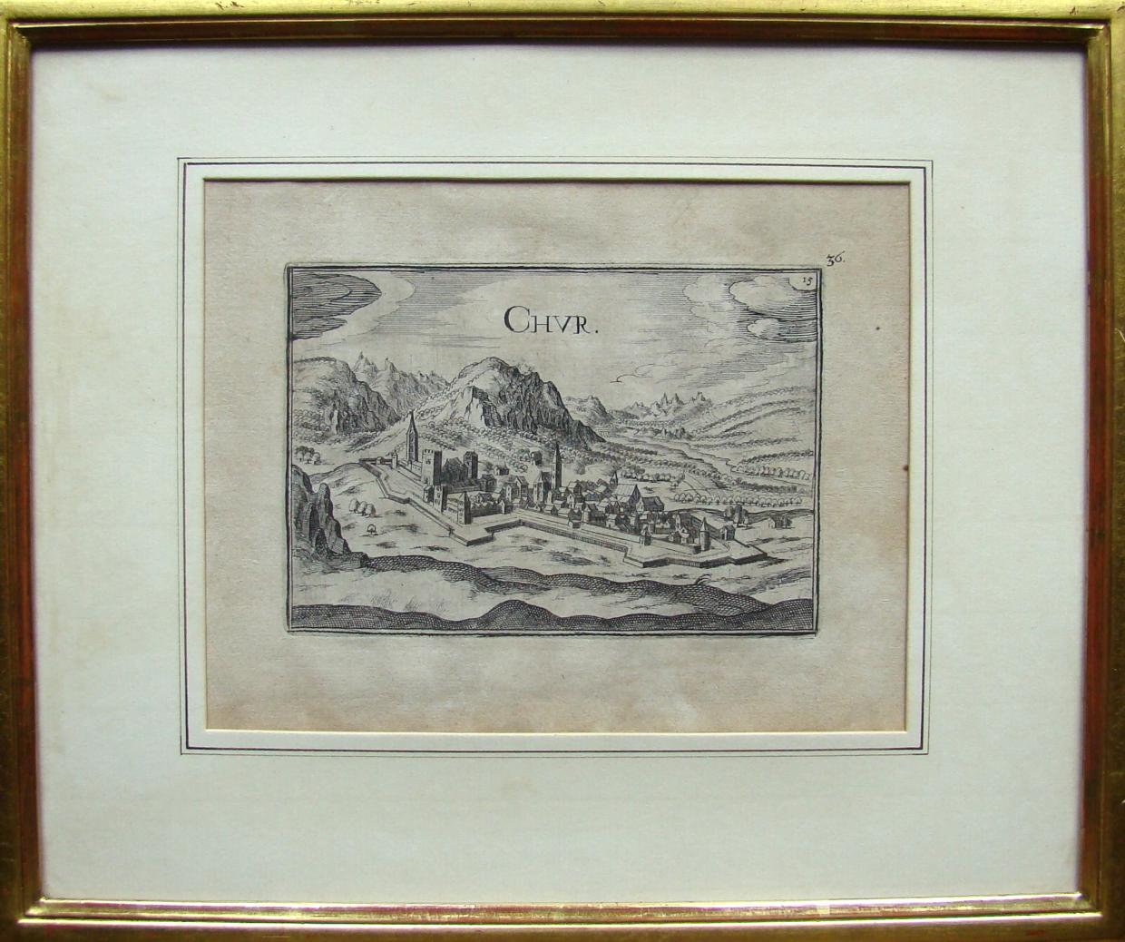 Ansicht der Stadt Chur mit Stadtmauern und umliegender Landschaft, Kupferstich , 10.5 x 15 cm, um 1640