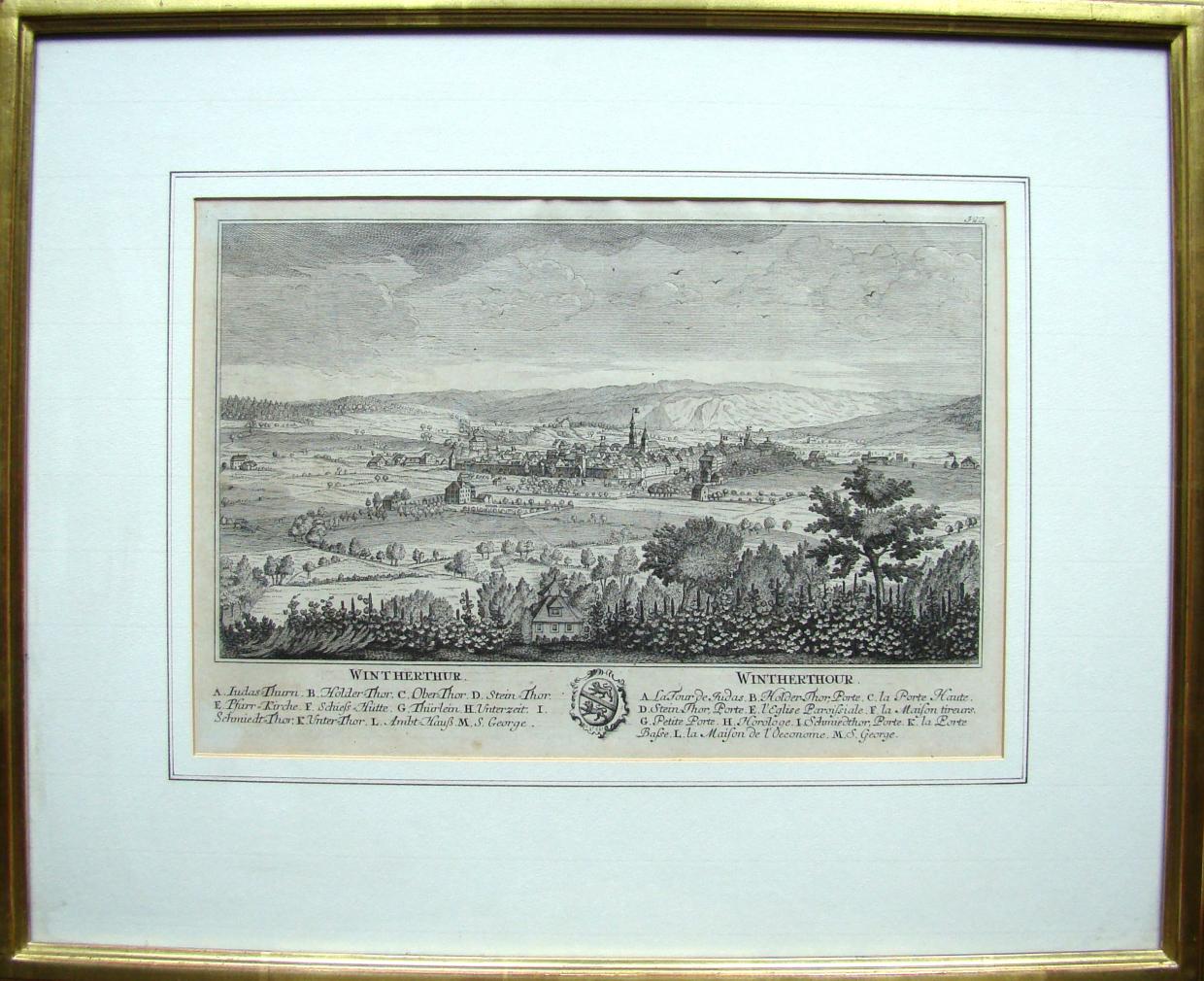 Ansicht der Stadt Winterthur mit Stadtmauern umliegender Landschaft. Anbei noch eine kleine Legende mit Übersicht über die bedeuteten Bauten sowie heraldisches Wappen der Stadt.