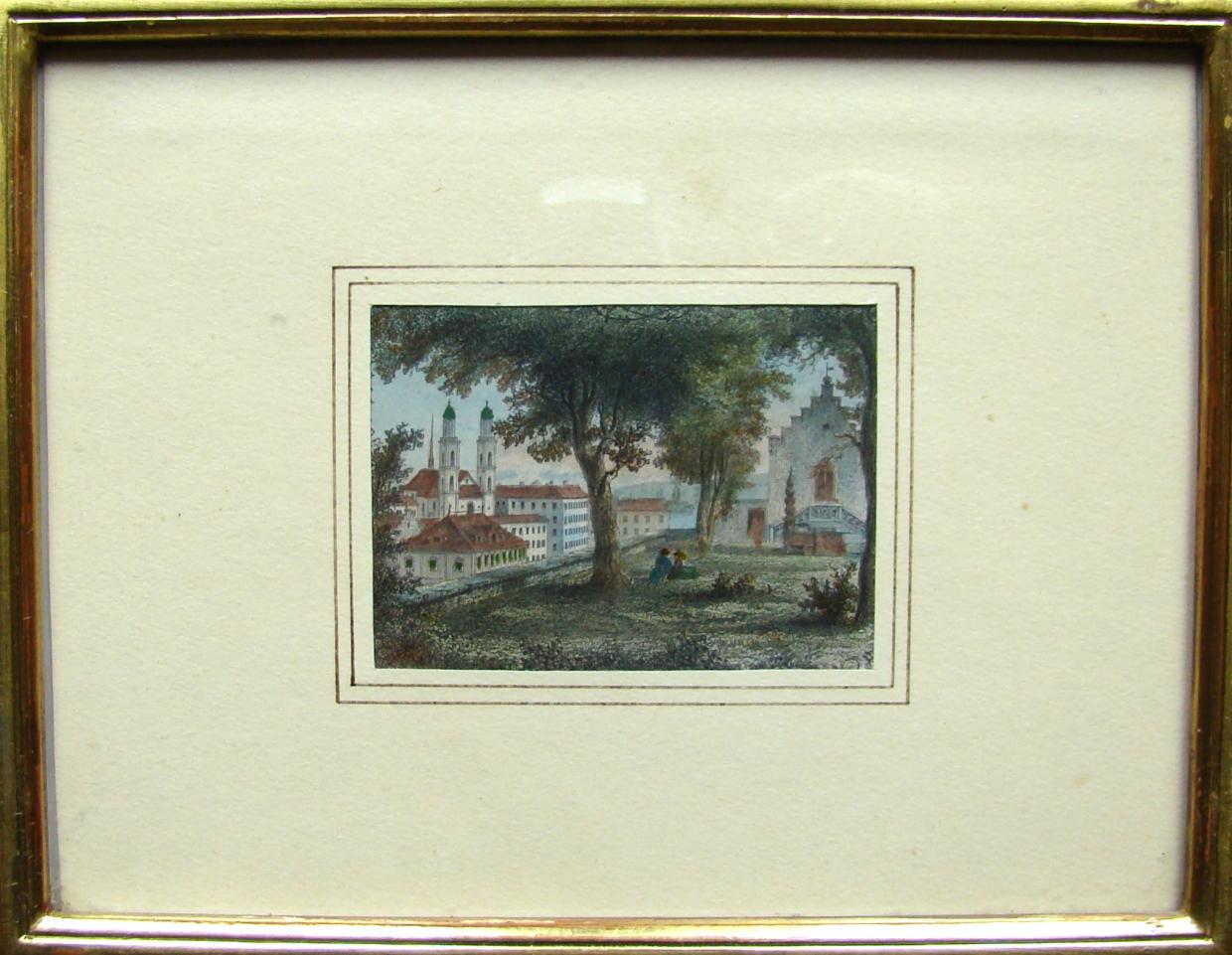 Ansicht des Lindenhof in Zürich mit Blick auf das Grossmünster, Kupferstich, handcoloriert. gerahmt im Passepartout, 5 x 7 cm, o.J.