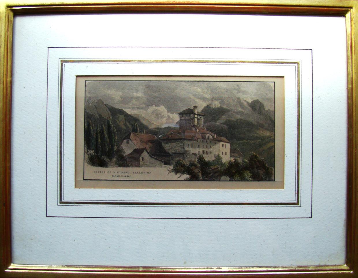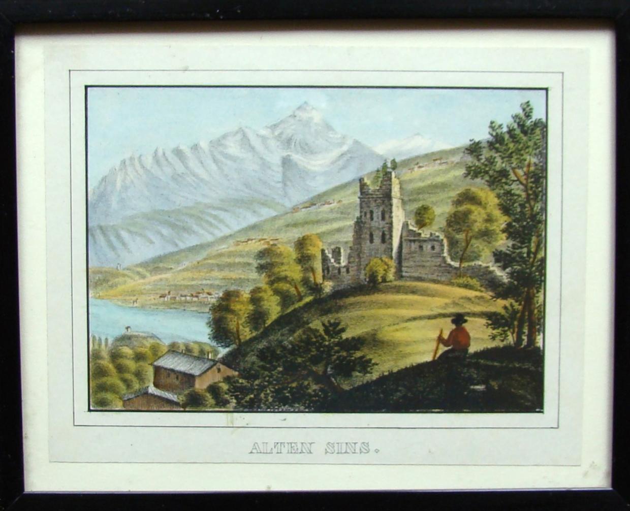 Ansicht auf die Burgruine Sins bei Paspels mit Blick auf den Beverin, Lithographie, handkoloriert. gerahmt, 12.5 x 16 cm, Paspels